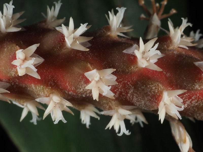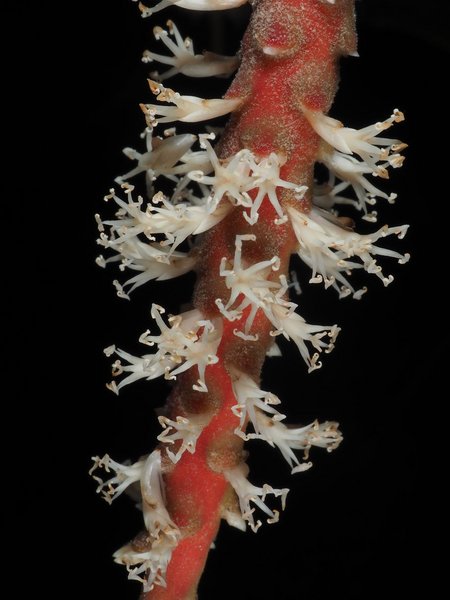 Blomsterne sidder indsunket i små gruber i blomsterstandens lange grene. Der er to hanblomster og en hunblomst i hver grube. Hanblomsterne er de første til at åbne sig. Og først når alle hanblomster er faldet af åbnes hunblomsterne. På den måde undgår palmen at bestøve sig selv.