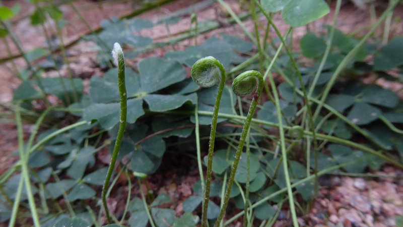 Et karakteristisk træk ved bregner er, at de unge blade er indrullede i spidsen, ligesom en bispestav. Ser man godt efter, kan man observere lige netop dette hos kløverbregnen.
