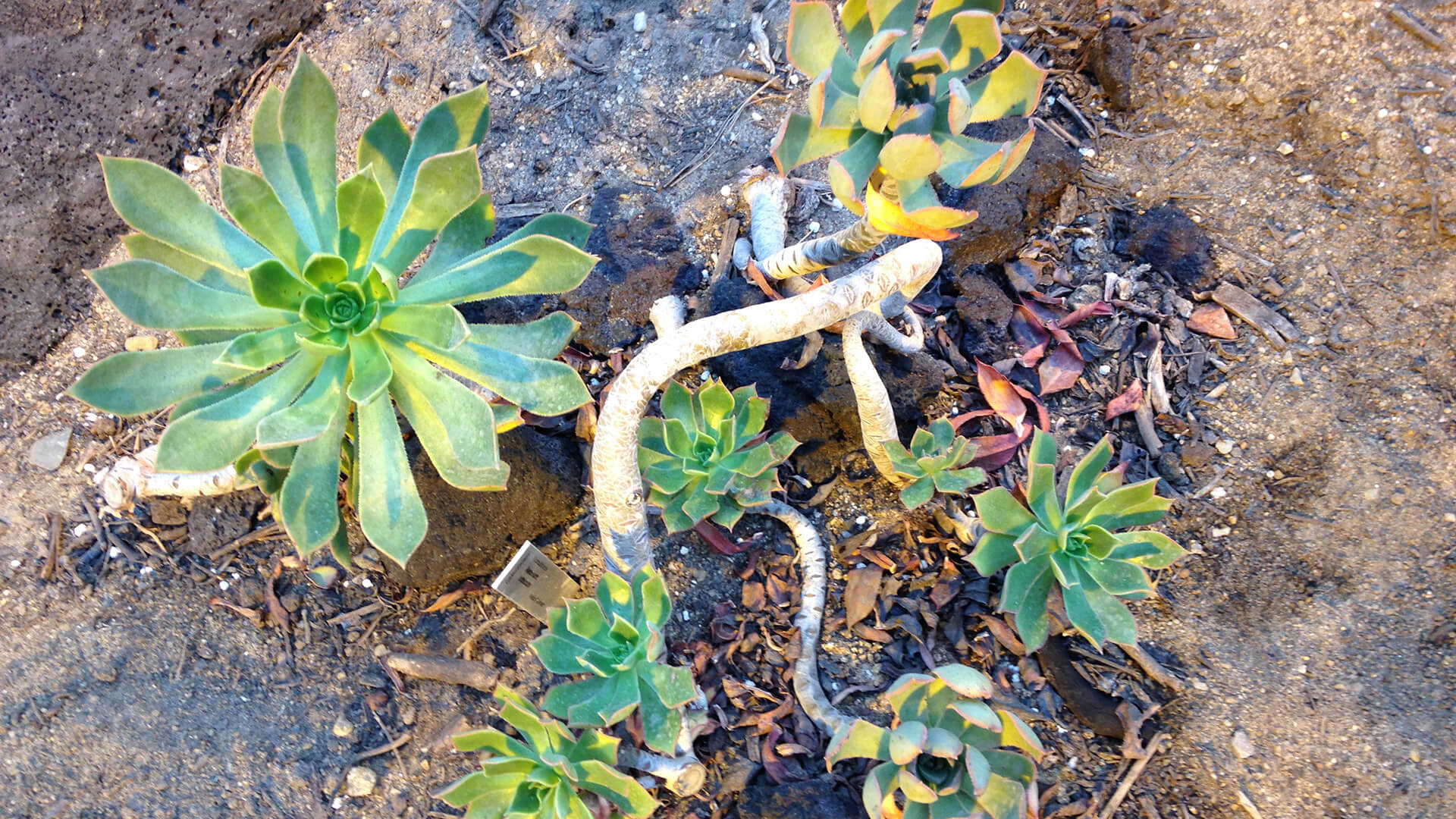 I bedet kan du finde en række forskellige arter af træhusløg fra De Kanariske Øer. Træhusløg er beslægtet med de husløg (Sempervivum), der findes i mange danske haver. Træhusløg tåler imidlertid ikke frost og kan derfor kun dyrkes indendørs i Danmark.