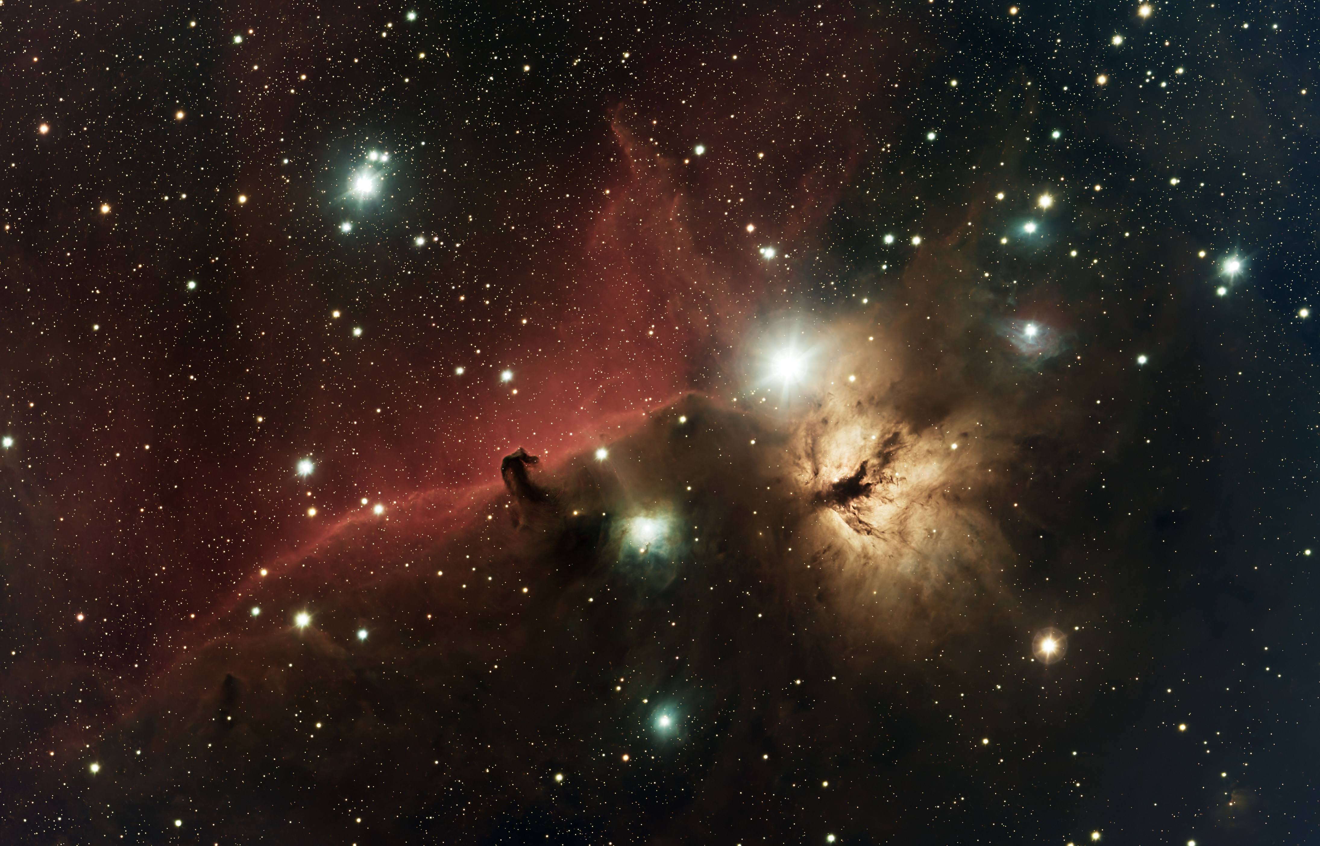 Billedet er taget 27. december 2025 under stjerneklar himmel med et farvekamera og et 8-tommers teleskop på Ole Rømer Observatoriet. Feltet svarer til ca. seks fuldmåner i bredden og fire i højden. Hestehovedtågen ligger omkring 1400 lysår væk.