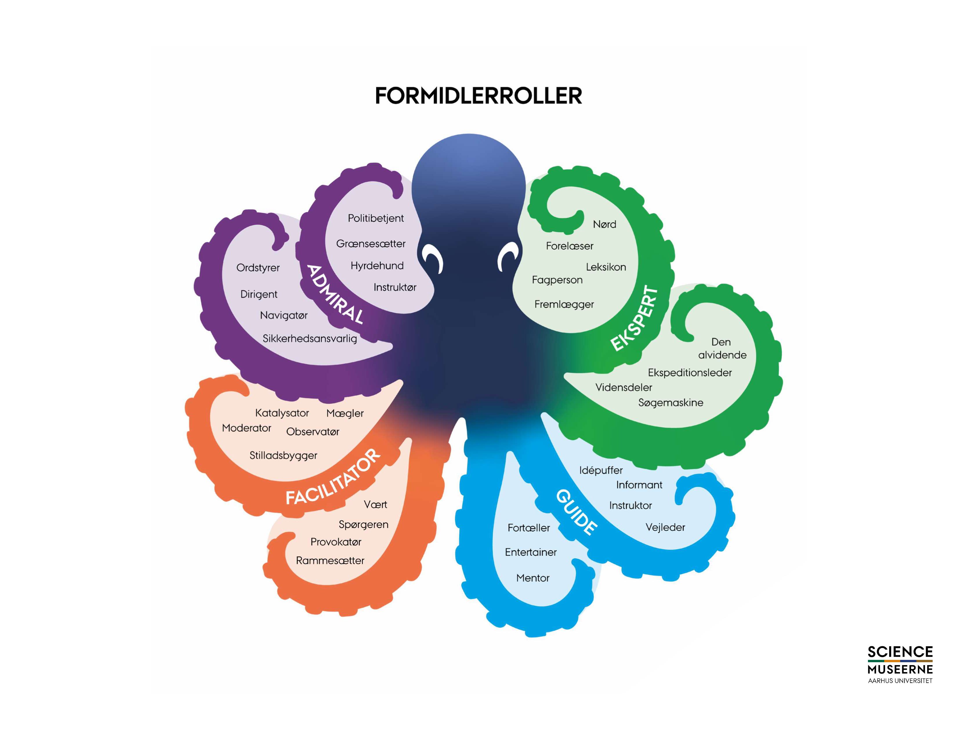 Modellen er formet som en blæksprutte med fire arme, fordi man som formidler ofte jonglerer med flere rolletyper undervejs i en formidlingssituation. Modellen er opbygget som en ikke-hierarkisk struktur, fordi valget af rolle afhænger af den gruppe og den kontekst, man står overfor.